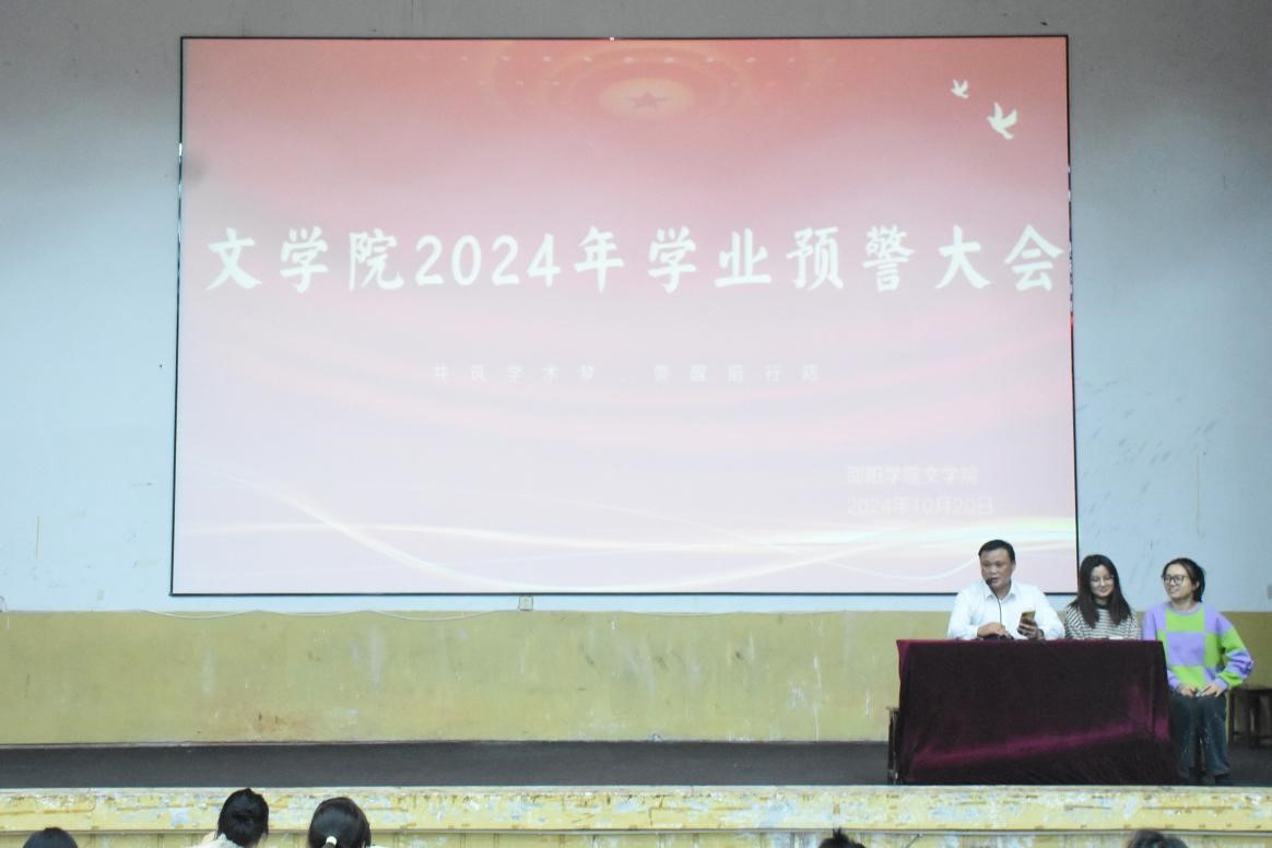 为加强学生学业管理,促进学院学风建设,提高教育教学质量,帮助所有学生顺利完成学业,文学院于10月20日晚19:00点在一栋教学楼报告厅召开了2024年文学院学业预警大会。本次大会由文学院教务、学工共同筹备,教务彭国老师、学工22级辅导员曾议莹、21级辅导员何曦冉老师共同主持。