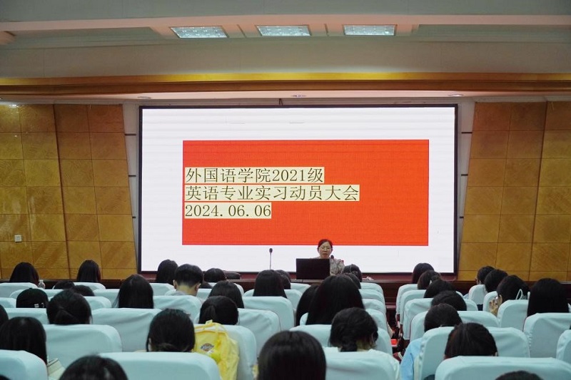 为帮助外院学子更好地融入实习工作,保障实习工作顺利进行,6月6日下午,外国语学院在李子园校区系办二楼报告厅举办2021级英语专业教育实习动员大会。本次大会由外国语学院副院长蒋芬主持,21级全体学生参加。