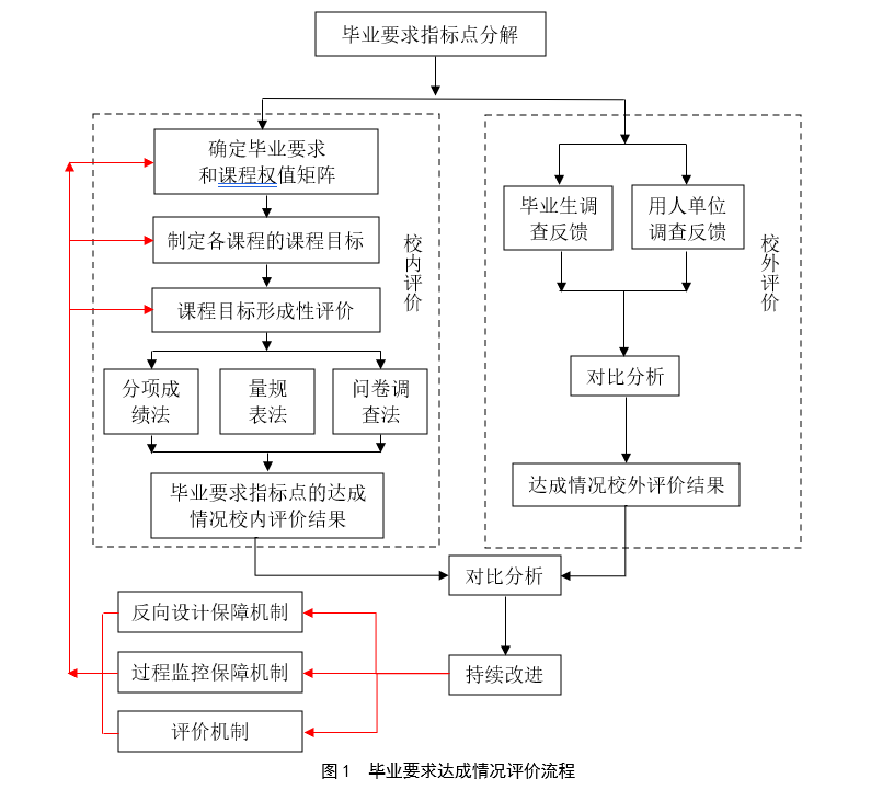 各专业毕业要求达成情况评价主要是采取校内评价(直接评价)和校外评价(间接评价)两种主要方式,如图1所示。